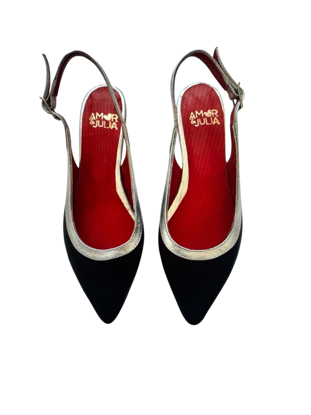 CUERO NEGRO CON RIBETE PLATA, SIN TALON CON TIRA DE SANDALIAMEDIDAS : TALLE 36: 23 CM, TALLE 37: 24CM, TALLE 38: 25CM, TALLE 39: 26CM TALLE 40: 27CM, TALLE 41, 27,5 CM