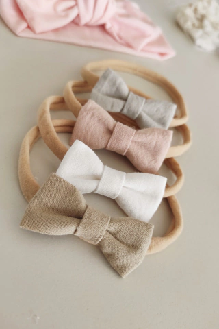 Vincha de nylon con moño de tela. Pensada especialmente para bebitas, ya que la vincha es súper suave y no ajusta y el moño es sumamente delicado, mide sólo 4 cm.