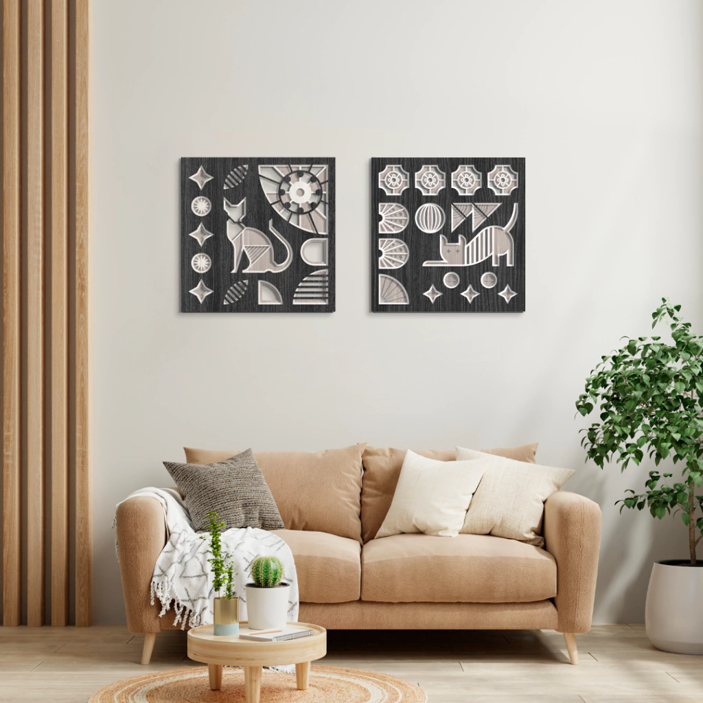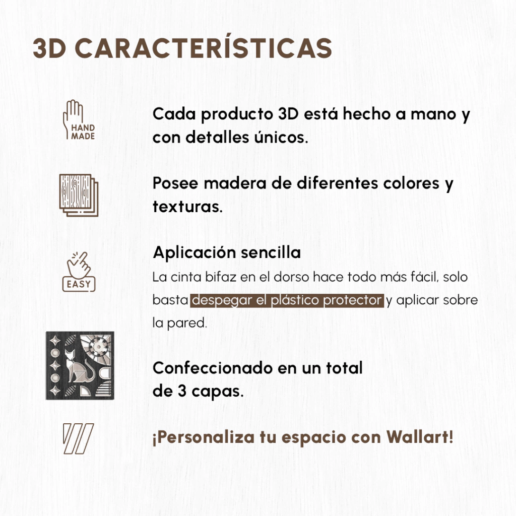 Wall Art 3D - Gatos(Se incluyen los dos cuadros que se muestran en la imagen)Diseño realizado con varias capas de maderas, creando una pieza unica texturada y que da un efecto de relieve increibleCARACTERÍSTICAS -- 3 capas de madera texturadas- Terminados a mano, para que cada diseño sea unico- Viene perfectamente embalado, para que llegue a tu casa en optimas condiciones- Se pega a la pared con cinta bifaz de primera marca, con lo cual es facil de retirar de la pared sin dañarlaMEDIOS DE PAGO -Todas las tarjetas de crédito o débito - 3, 6 o 12 cuotas sin interés por Mercado PagoCentros de pago: Pago Facil / Rapi PagoTransferencias (10% de descuento)PREGUNTAS? -¡Escribinos a nuestro WhatsApp para que podamos responderte cualquier duda!