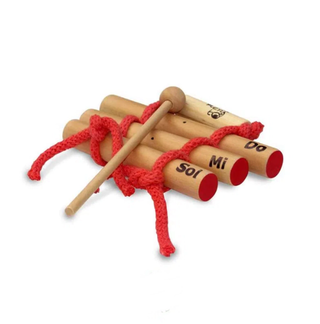 INSTRUMENTO MUSICAL3 cilindros de madera maciza, un manija de sujeción y 2 bolitas terminales, se anudan entre sí mediante soga de algodón. Afinado a 440hz, las notas del DoM forman el acorde de Do Mayor: DO (C), MI (E) y SOL (G). Incluye 1 baqueta de madera.