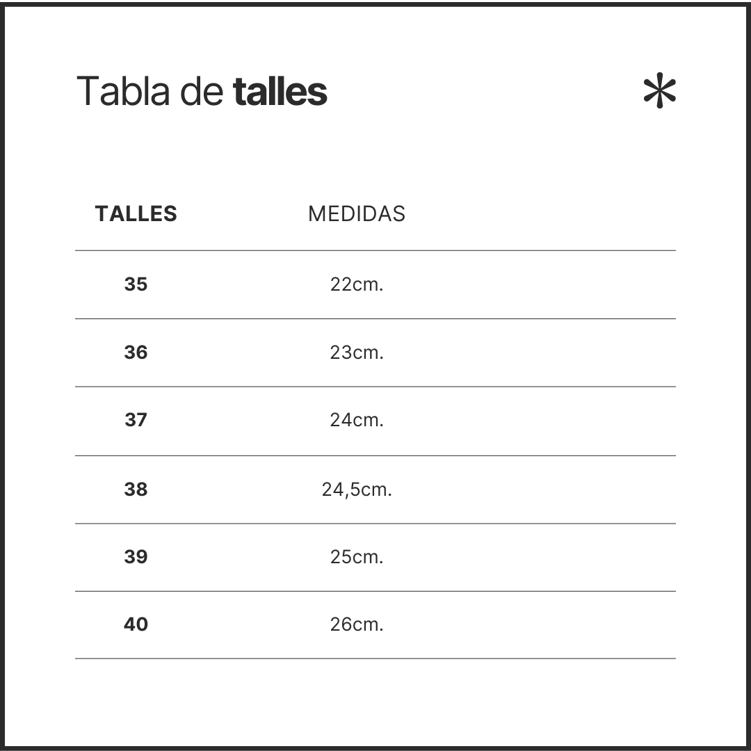 *Recorda que esta tabla es una guía general y que los tamaños pueden variar ligeramente entre diferentes estilos de zapatos, en la descripción de cada uno siempre solemos detallar la horma de ese modelo especifico. Si tienes alguna duda o necesitas ayuda para encontrar tu talle, no dudes en ponerte en contacto con nosotros!