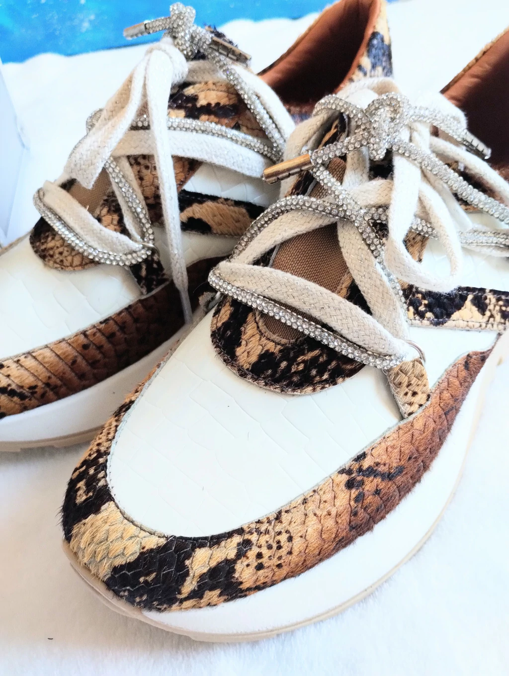 Zapatilla de cuero vacunoPelo reptil y cuero charolado blancoCon cordonera dobleCordones de algodón natural e hilos plata + cordones de strass con terminales metálicasEmpeine con elástico para fácil calceRecomendamos llevar el talle habitual