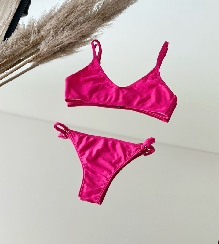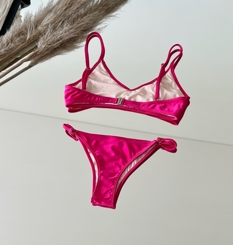 Conjunto de bikini de lycra brillosa. Corpiño con escote y ganchito para atar en la espalda. Bombacha estilo colaless regulable.