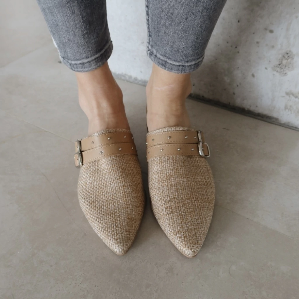DescripciónMules de rafia combinada con detalle de dos cinturones con tachas color beigeBase suelin PUSon de horma justa / en punta !(Tener en cuenta que al ser en punta, el pie no llega al final del calzado)Confección + CuidadoEco-cueroLimpieza en seco#RudTip: Reversionamos los mules de rafia que tanto aman. Los detalles son todo lo que estabien rockero y sofisticado a lavez! Son un MUST y por sobretodo mega cómodos!Guía de tallesMedida de la plantilla35: 22,5 cm36: 23 cm37: 24 cm38: 24,5 cm39: 25,5 cm40: 26,5 cm20% descuento pagando en efectivo (válido solo para nuestro showroom, no acumulable)